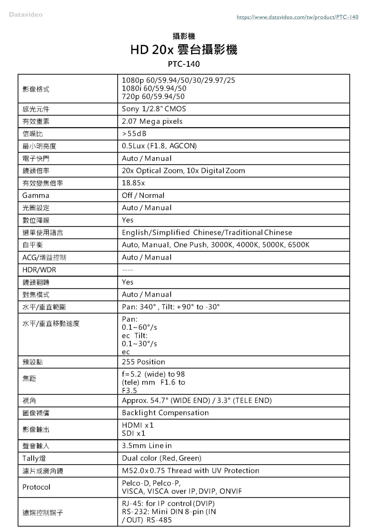 PTC-140 HD 20x 雲台攝影機